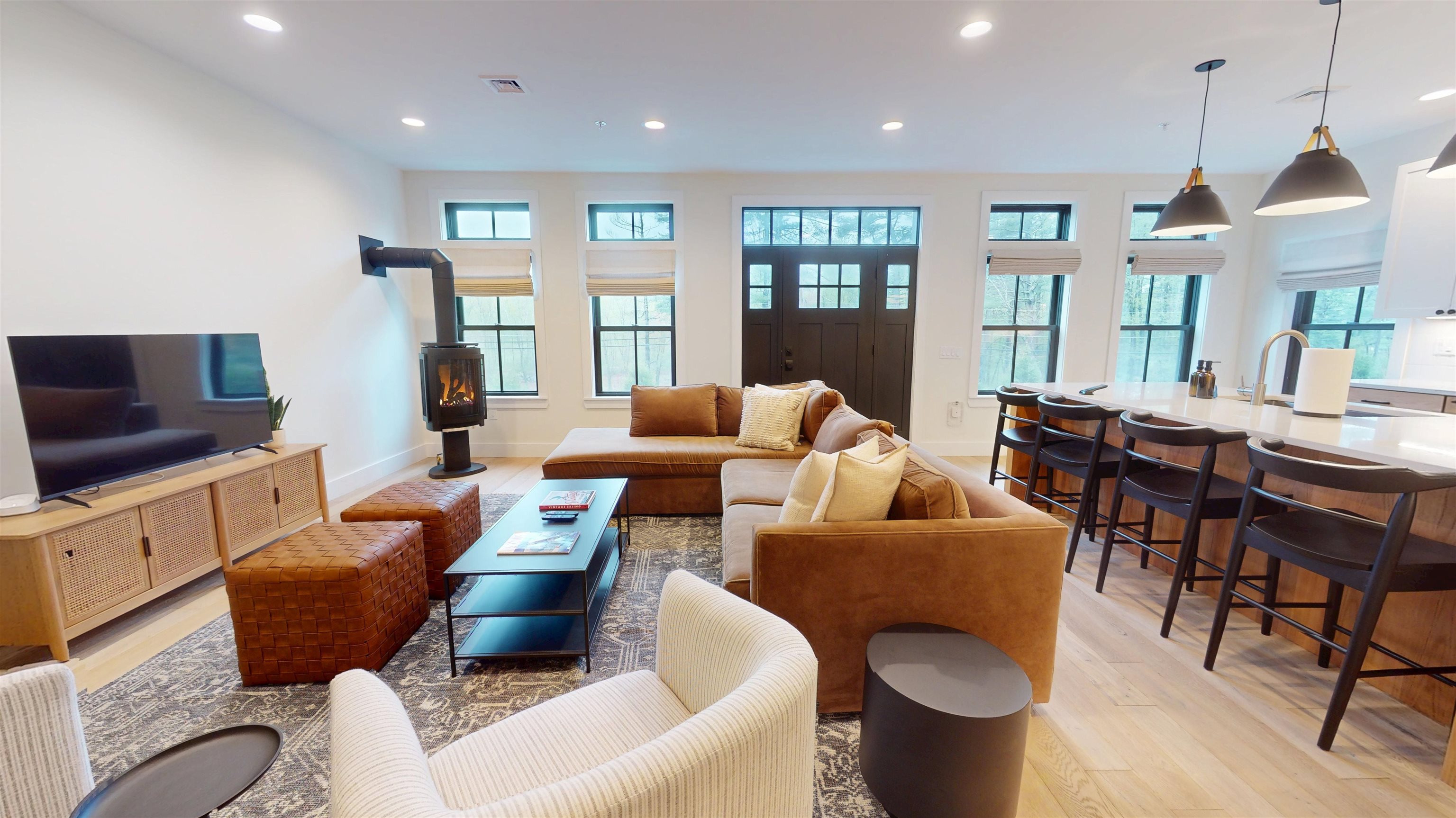 Minutes to Stowe Mountain Resort. 4 bedrooms 3 ½ baths 3, 390 sq’ including a one car garage and additional ski sharpening/storage room. Fully furnished for own use or short term rentals. Middle unit looks west over the West Branch and Rec Path to Trapp Hill ridgeline and up the Mountain Road to the slopes at Stowe Mountain Resort. Features include high ceilings throughout, central AC, heat pump with propane back up. The open kitchen-dining creates a great entertaining space. Walk-in pantry. Living room has Jotul gas fireplace. The primary suite features 10’ cathedral ceilings a soaking tub and shower. Lower level features high ceilings, 3/4 bath, 4th bedroom and large family room. Vermont Vernacular design of The Landing, by renown architect Sam Scofield, is in keeping with the original Stowe-A- Way antique farm house dating back to the 1800’s. Stowe Mountain Resort 4.4 miles, Stowe Village 3.2 miles, BOS 3:15, BTV 45 minutes. On Mountain Shuttle bus route for easy access to Stowe Mountain Resort and Stowe Village. The Recreation Path is across the street. The Landing sits on 2.5 acres with over an acre of Common Area for homeowners, their families and guests to use for recreation, picnics, dog walking, snow shoeing and for children to play and build snow-forts. Rental history since December 2024. Appraisal projects a 10% CAP Rate for short term rentals at The Landing. The furnishing pictured may vary slightly. A complete inventory will be provided.