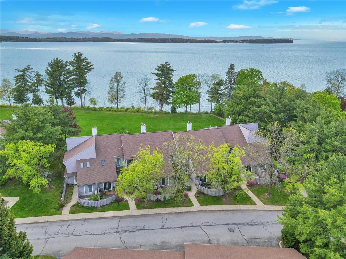 Beautifully maintained 2-bedroom, 2.5-bath condo is perfect for those seeking the peace of LAKESIDE LIVING without giving up the conveniences of town. Perched above Shelburne Bay, the home offers stunning west-facing views from the living & dining rooms—your front-row seat to Vermont’s breathtaking sunsets. The sunlit living room features a gas fireplace & sliding doors to a private back deck, ideal for morning coffee or evening wine. An elevated dining area has the same lake views, creating a seamless flow for everyday living and entertaining. The modern kitchen includes stainless appliances, granite countertops, & modern cabinetry. A first-floor office opens to a private front patio, a thoughtful touch for those working from home or seeking a quiet reading retreat. Upstairs, the primary bedroom suite invites you to wake each day to serene views of Lake Champlain, with an updated en-suite bath for added comfort and style. A 2nd bedroom with a private full bath is located just down the hall, separated by a convenient laundry room. Additional features include mini-split heating and cooling, newer carpeting, and a large detached garage with ample space for a vehicle and storage. As part of a well-managed lakeside community, residents enjoy shared access to a PRIVATE DOCK, MOORING RIGHTS(ideal for keeping your boat in the summer-buyer may install), and a tennis court. All close to Burlington’s vibrant dining, shopping, and airport, this is Vermont living without compromise.