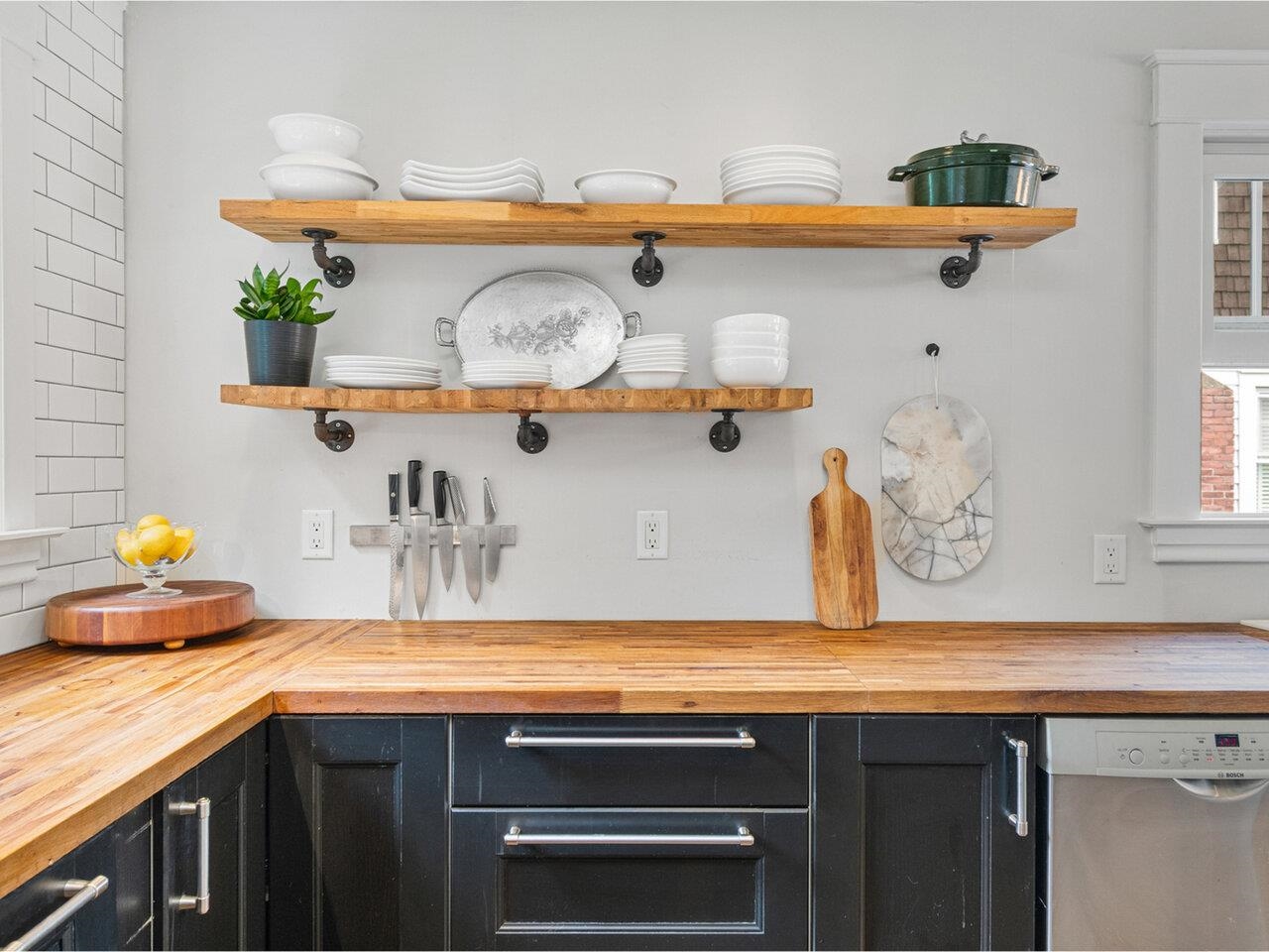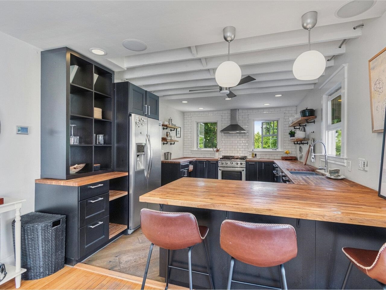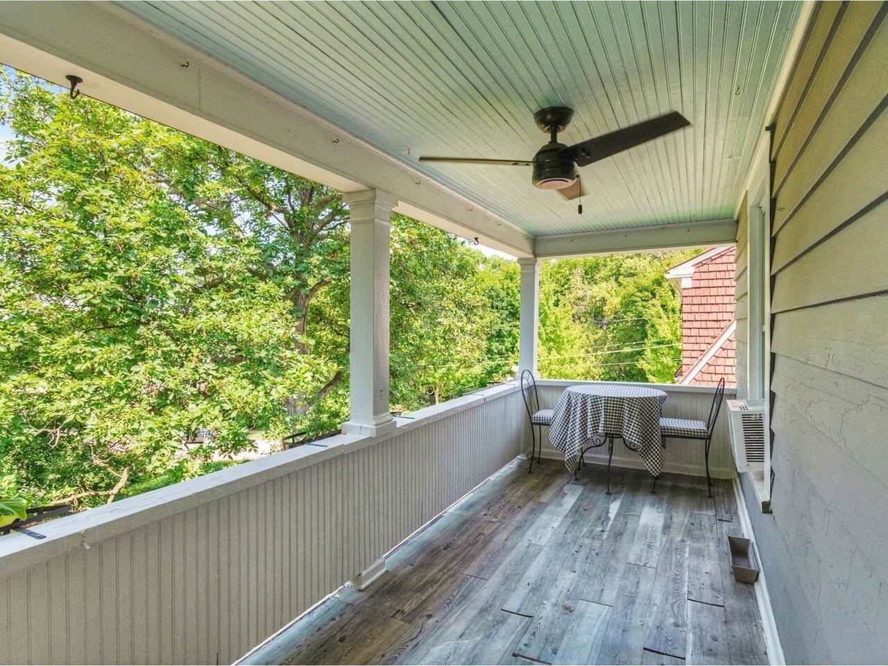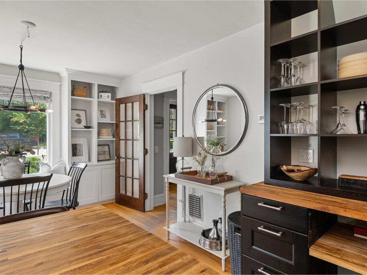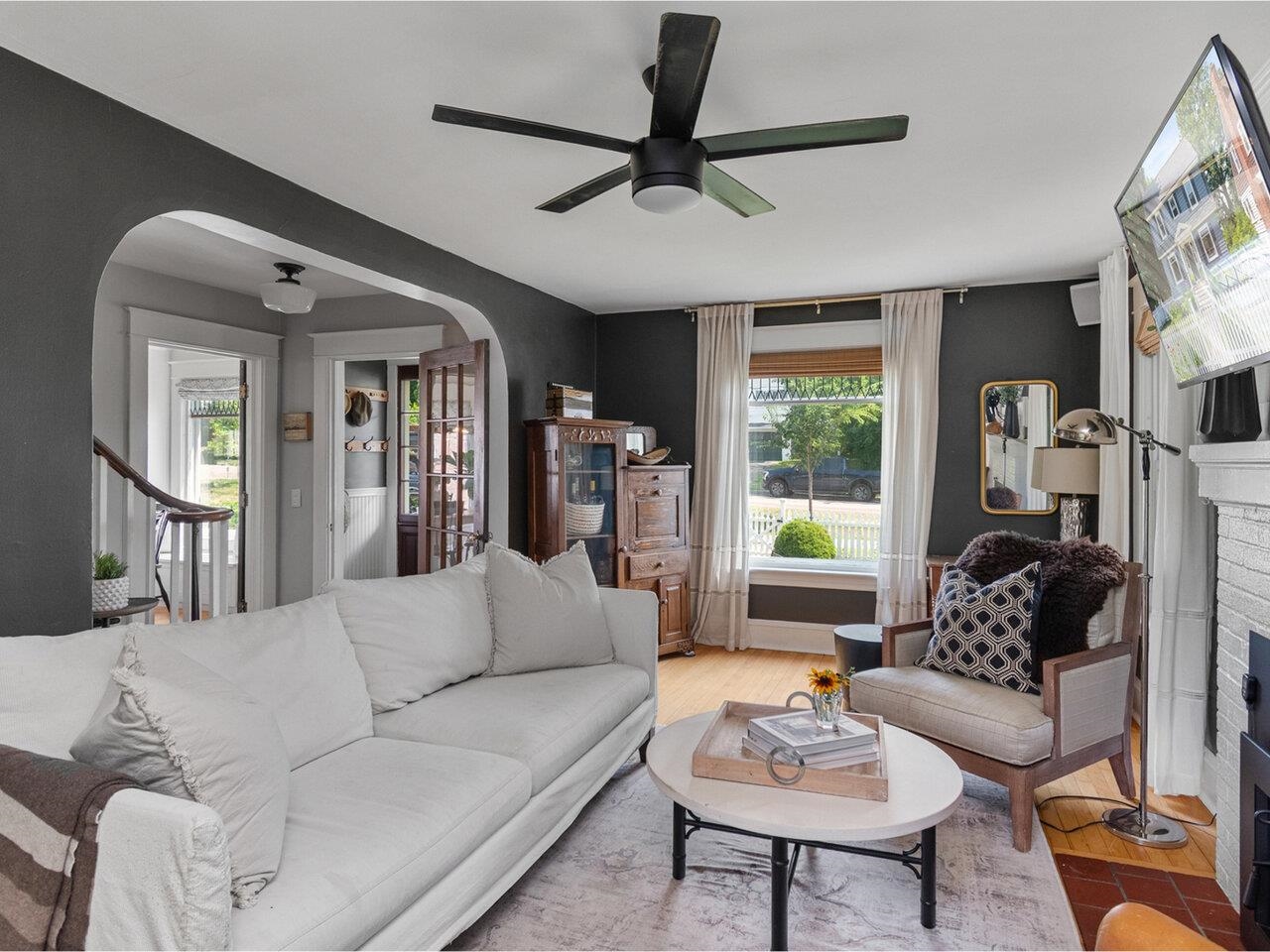 Framed by a white picket fence, this classic 1930's colonial home in Burlington's popular South End is a wonderful blend of historic charm and modern amenities! Adjacent to the historical, sought-after 5 Sister's Neighborhood, this three-bedroom home features a 2nd story covered porch, a great place to enjoy seasonal panoramic views and cool breezes off Lake Champlain. The porch overlooks a private backyard with perennial gardens & a sunken lower deck, an ideal urban oasis for entertaining. A sweet covered porch greets you at the front entrance, complemented by the striking color scheme of the newly painted exterior. This 2-story vintage home features an updated modern farmhouse kitchen with butcher block counters, exposed rafter ceiling, subway tile backsplash, energy-efficient appliances, and breakfast bar. On the other end of this spacious room is the sunny dining area with built-in bookcases flanking a large window seat. The comfortable living room features refinished wood floors, built-in bookcases, a classic wood fireplace, and large windows overlooking the front and back yards. On the second level are 3 cozy, bright bedrooms, and a full bath. The walkout basement offers plenty of storage and garage space for 1 car. Close to downtown Burlington shops, restaurants, bike path, & waterfront, as well as the South End Get Down, Farmers Market, Art Hop, & Callahan Park, practically at your doorstep! An unbeatable location and abundant charm all in one!