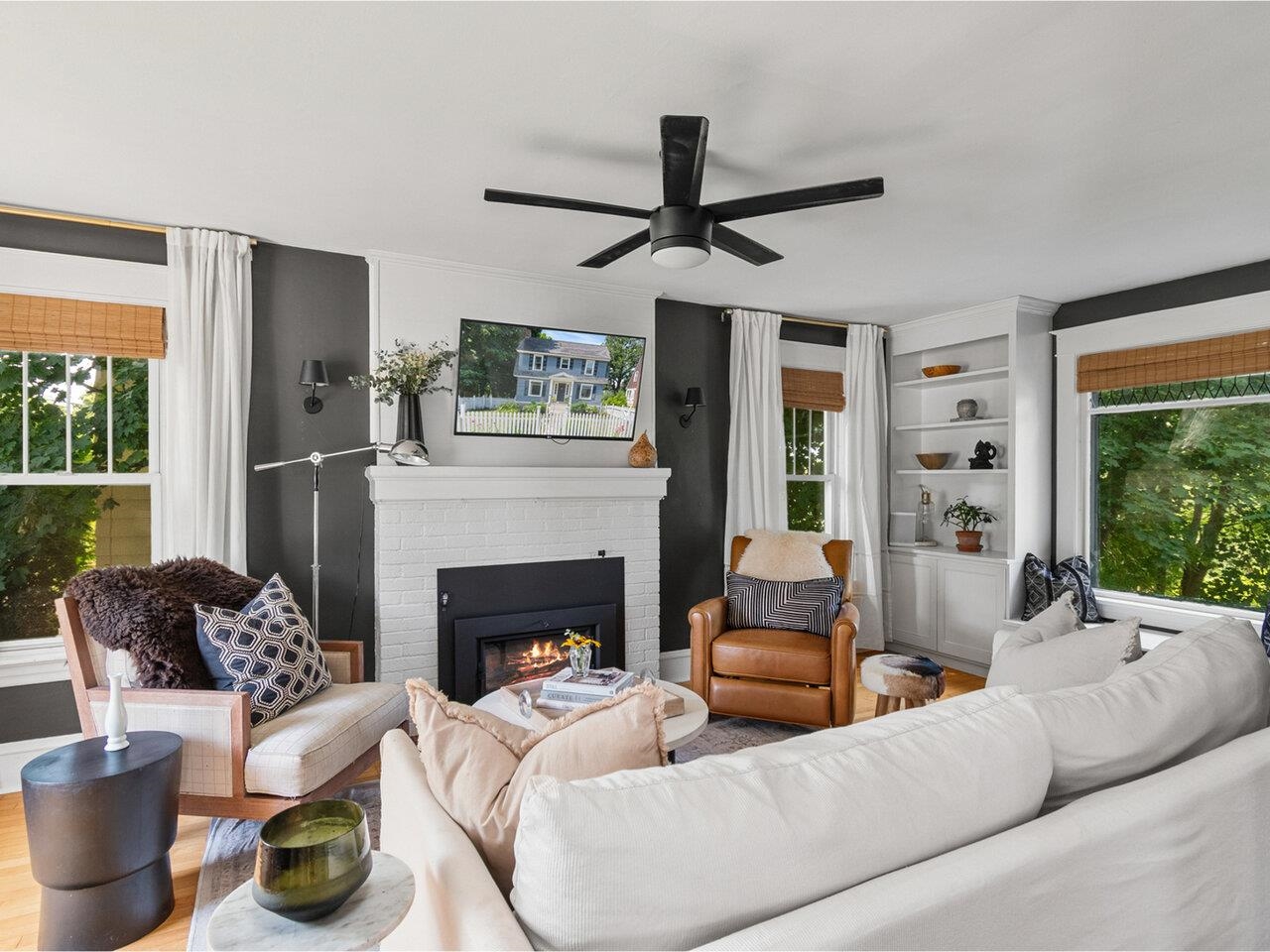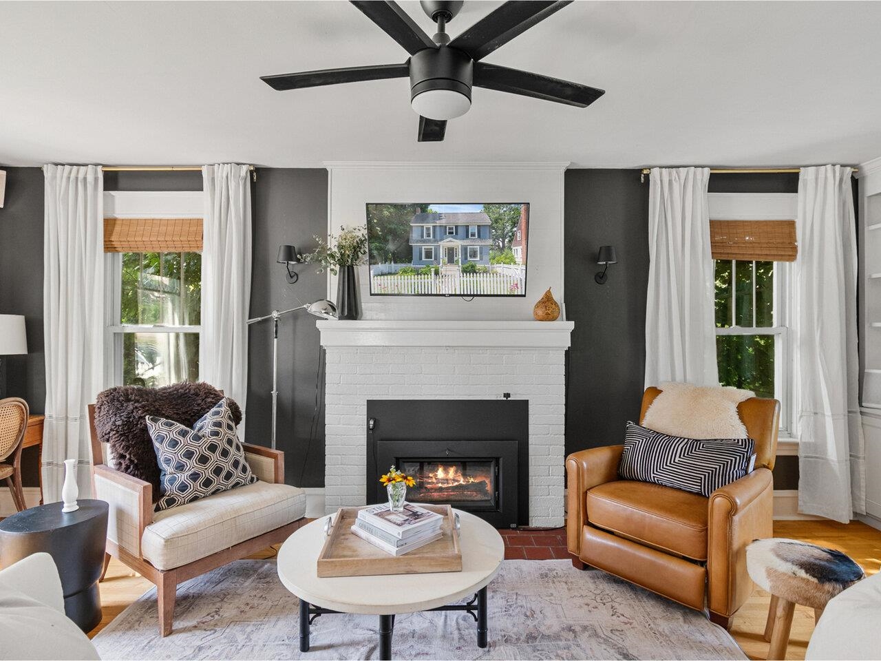 - Ceiling Fan, Dining Area, Wood Fireplace, 1 Fireplace, 2 Fireplaces, Kitchen/Dining, Window Treatment, 1st Floor Laundry, Walkup Attic