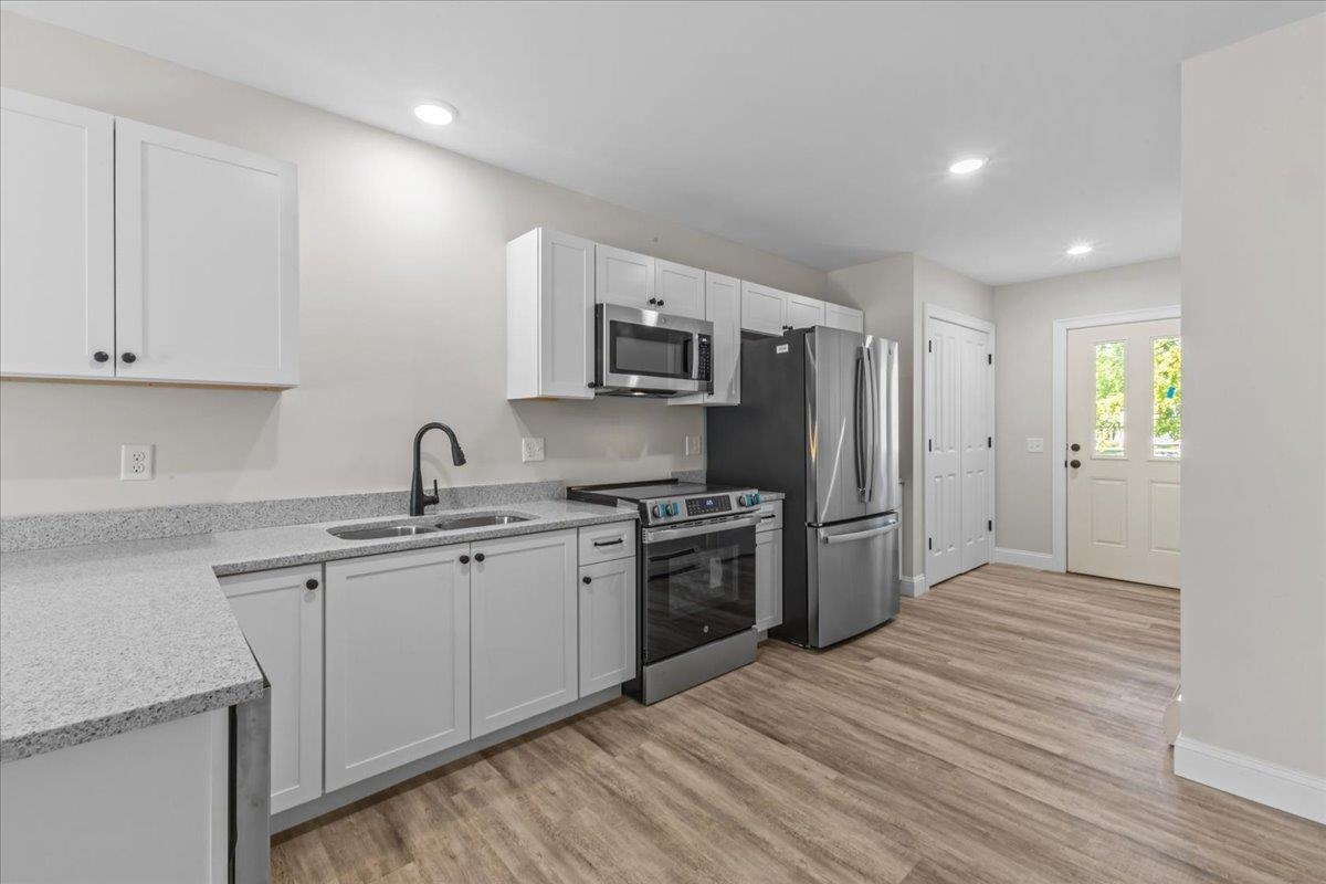 Welcome to Unit #106 at Willys Lane — a brand-new 2 bedroom flat designed for stylish, single-level living. This thoughtfully finished home features a bright open floor plan with a crisp white kitchen complete with quartz countertops, stainless steel appliances, and plenty of storage. Durable vinyl plank flooring adds a modern look that’s easy to care for, while large windows fill the space with natural light. The private primary suite is a true retreat, offering its own full bath and generous closet space. A second bedroom and a ¾ bath provide flexibility for guests, family, or a home office. Step outside to enjoy your own private patio — perfect for morning coffee or evening relaxation. With a washer and dryer included, an attached garage roughed in for EV charging, and energy-efficient construction throughout, this home makes everyday living both effortless and enjoyable. Set in a boutique 8-unit community just moments from shopping, dining, and parks, Unit #106 combines comfort, style, and convenience in one exciting package.