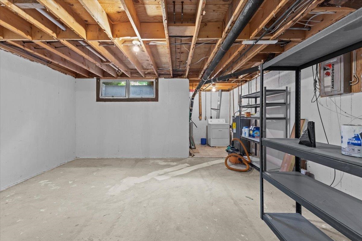 - Concrete Floor, Full, Partially Finished, Interior Stairs, Storage Space