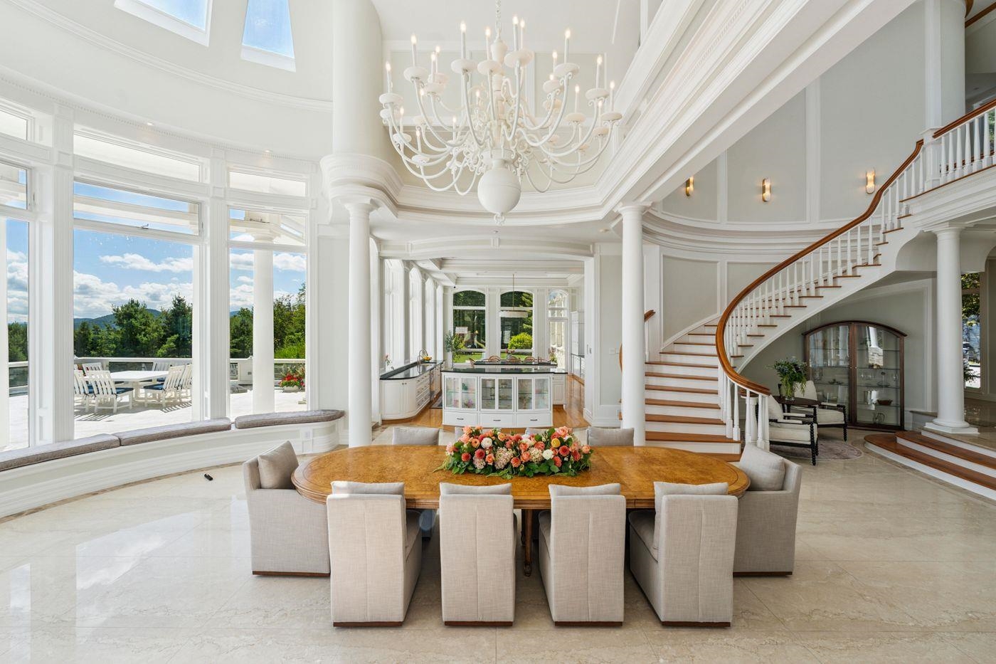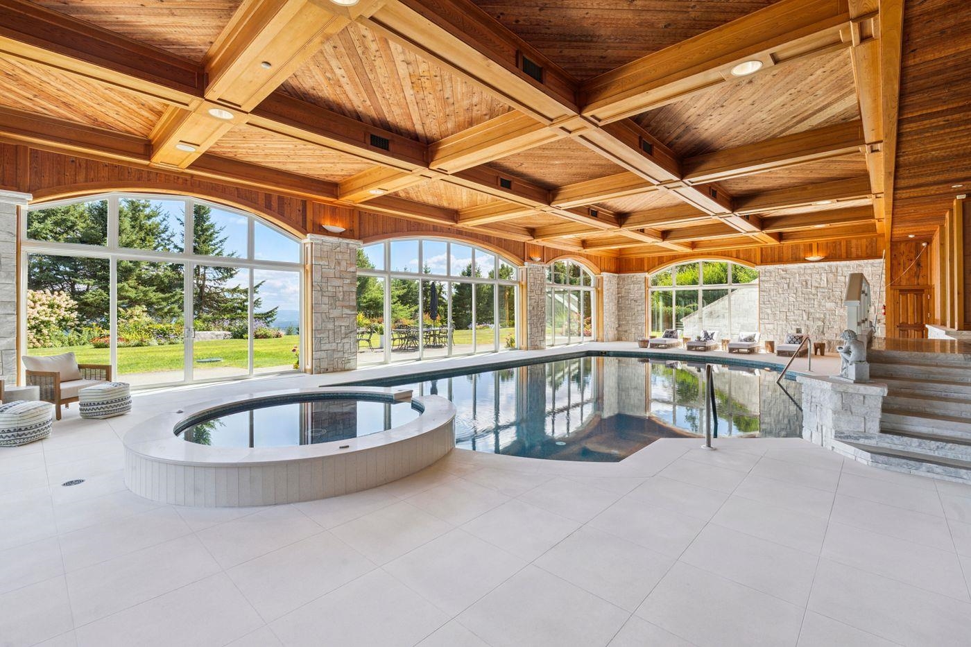 A design and materials masterpiece, Above the Clouds is one of the most spectacular estates in Vermont. Embedded into rock outcroppings on 15 pristine acres, the setting and views are simply breathtaking. Vermont Danby marble was brilliantly selected as the primary exterior material, and numerous local hardwoods, Italian marble, and sandstone are featured throughout the interior. A spectacular array of floor-to-ceiling windows brings the outside in, creating a beautiful, light-filled home with expansive views from every room. Crafted for grand entertaining, upon entry, a dramatic foyer leads to the dining and great room, which immediately directs your attention to a spectacular veranda and panorama to the mountains and valley below. The primary suite, a private oasis, includes a sunken seating area and splendid bath. Two spacious guest suites grace the upper level with individual terraces, fireplaces, and spa-like baths. A third, private suite, will comfortably host longer-term guests or serve as staff quarters. The lower level is an exquisite recreation venue. A full cocktail bar can host your guests before adjourning to either the 18-seat home theater or game room with marble fireplace; all overlook an opulent, indoor pool and spa. Outdoors is a perfect landscape with stone terraces providing unlimited vantage points and stunning views. Even the drive, forged in stone, provides a spellbinding entry to the property, evoking total privacy, revealing this grand estate.
