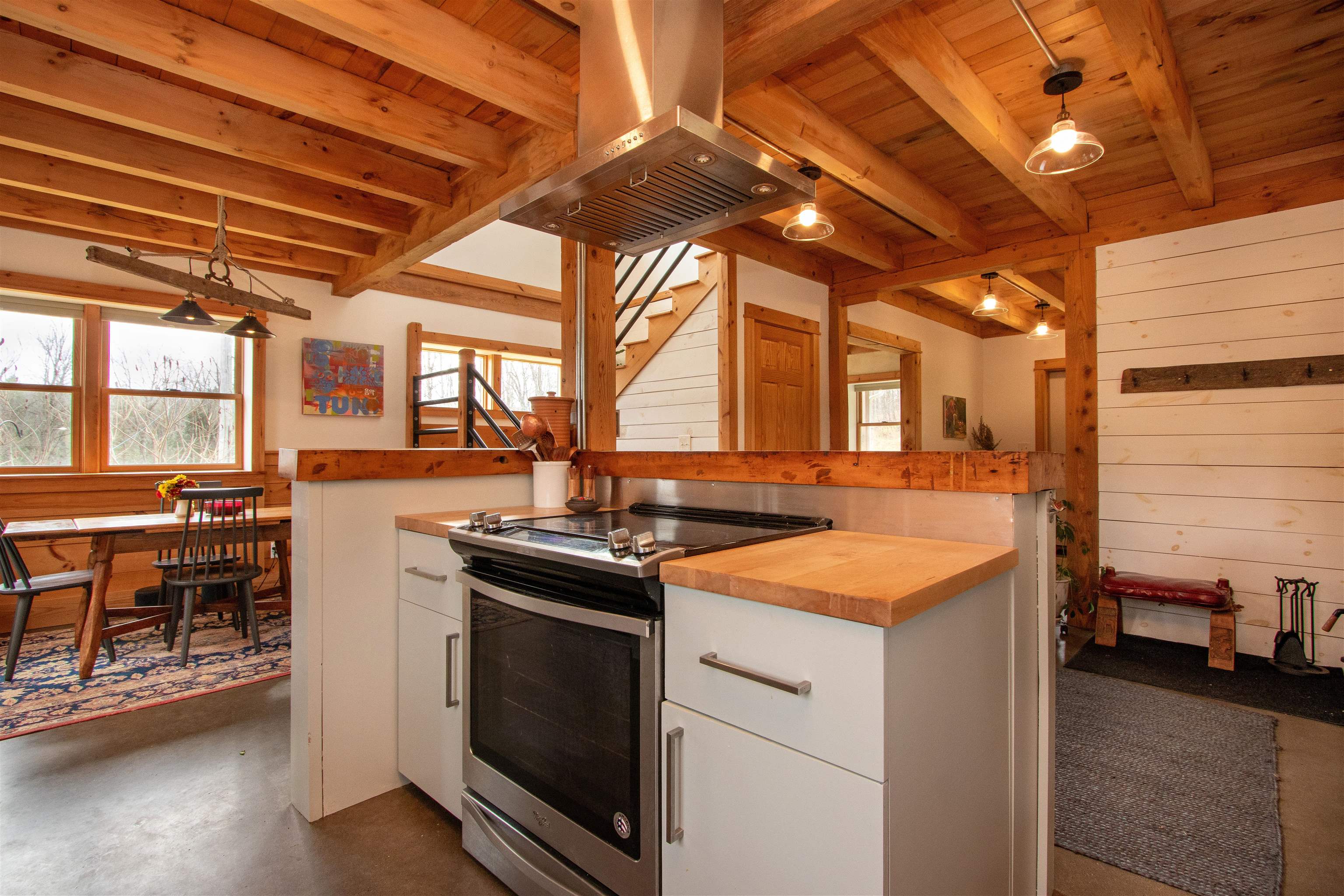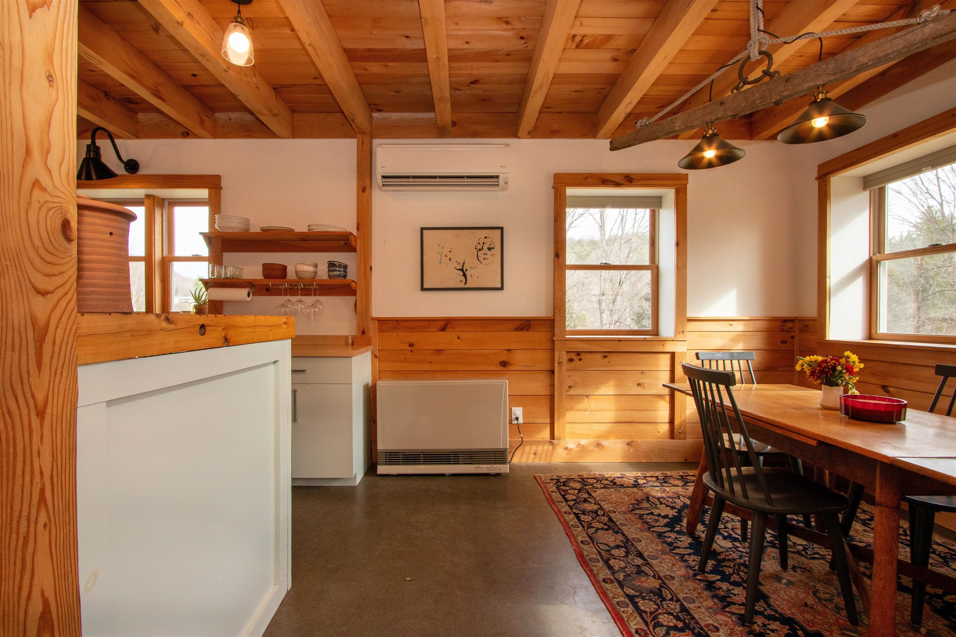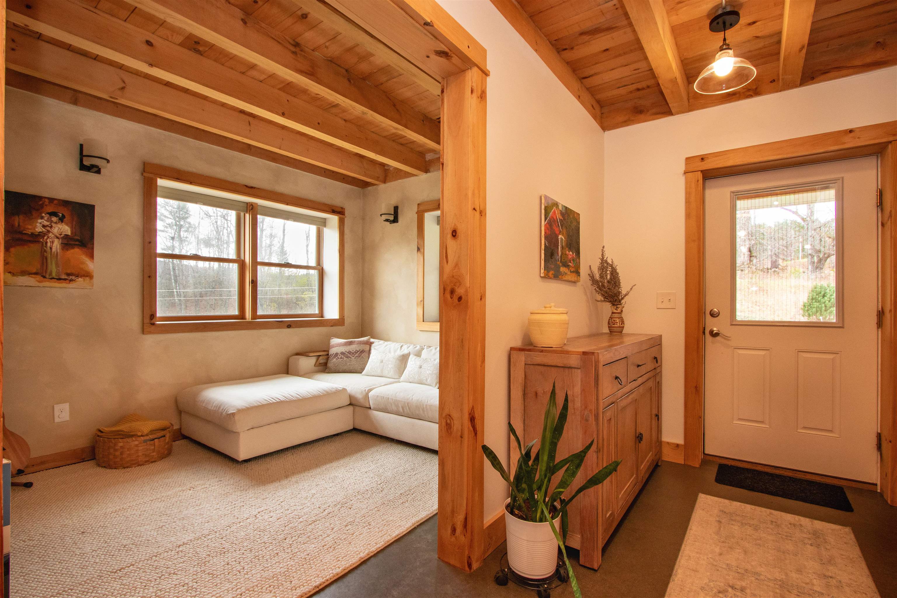Built in 2017 with thoughtful design and modern efficiency, this Williamstown home is a cool blend of modern meets Vermont charm. A welcoming wrap-around porch sets the tone, offering a spot to relax and take in the peaceful surroundings. Inside, the open layout is filled with natural light, warm wood accents, and exposed timber framing that gives the space its inviting feel. The kitchen features a central island with a stove, plenty of counter space, and windows overlooking the yard, and adjacent to a bright dining area. The living room is equally special with built-in shelving and beautifully finished limewash walls that add subtle texture and character. A cozy, high efficiency soapstone wood stove anchors the entryway, and a half bath completes the main level. Upstairs you’ll find three lovely bedrooms, a full bath, and convenient second-floor laundry. Built with energy efficiency in mind, the home features double-studded walls, a heat pump and Rinnai heater for year-round comfort. Outside, enjoy a yard featuring stone walls, flowering fruit trees, perennial gardens, and evergreens that offer year round privacy from the road. You’ll also find a handy shed and plenty of space for vegetable plots and play. Set in Williamstown, just a short drive from Barre and Montpelier and highly accessible to I-89, you’re under an hour to both Lebanon and Burlington, and proximal to New England skiing, mountain bike, and hiking destinations.