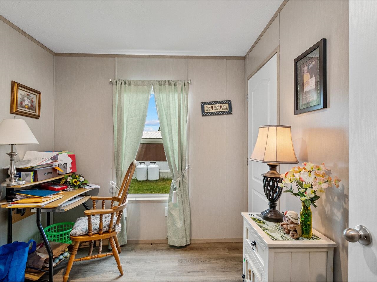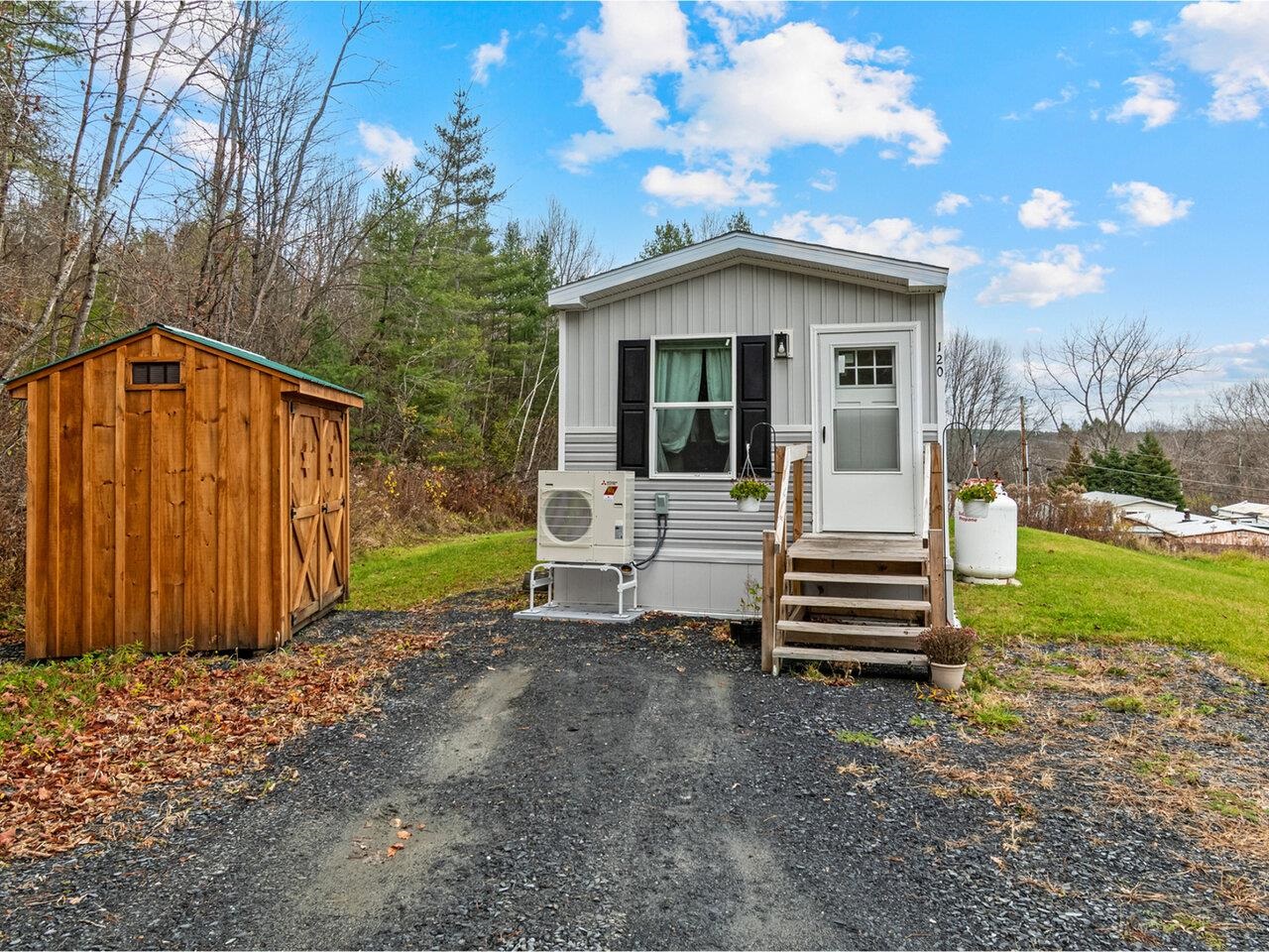 This beautifully updated, 2023 mobile home is stylish, efficient, and completely move-in ready. Welcome to 120 Bennington Drive, a 2-bedroom, 2-bathroom home that blends modern comfort with smart efficiency. Step inside to find a bright, open-concept living area, filled with natural light and characterized by a well-designed accent wall that provides an extra dose of character! The sitting room is both cozy and spacious, and opens into the incredible, updated modern kitchen, with higher end finishes, an oversized island, sleek cabinetry, and plenty of room to cook or entertain to your liking. Enjoy year-round comfort as the Seller has upgraded to a high-efficiency split unit, allowing home ownership to be a breeze - stay toasty warm in the winter or enjoy instant cooling in the hotter months. The primary suite offers a large bedroom and private full bathroom - also updated. A convenient laundry area sits off the primary, followed by a full guest bathroom and second bedroom. A 6' x 8' covered deck is constructed off the back, and is incredibly private - being the last lot, and shielded by greenery, it's the perfect spot to unwind. A brand-new shed adds even more allure, offering ample storage and a great aesthetic. This home is one that you will not want to miss; private, fully finance-able, and incredibly beautiful.