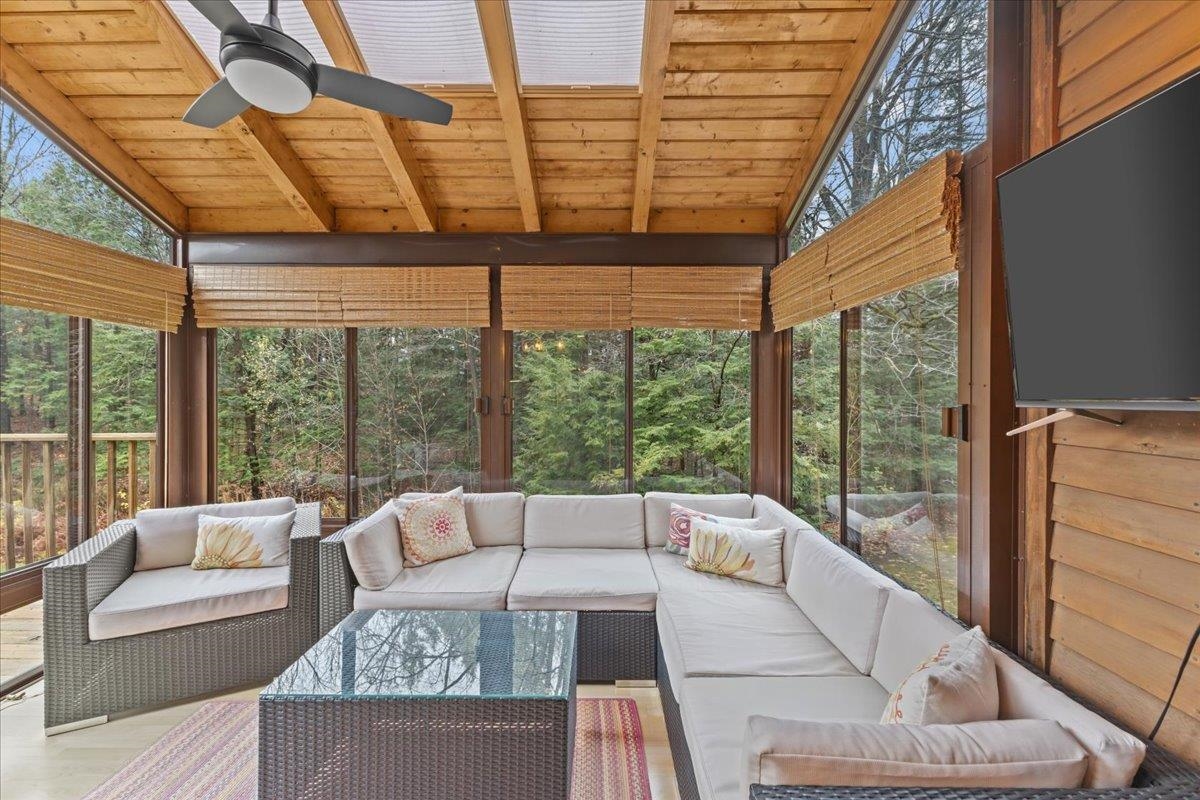 - Bar, Blinds, Ceiling Fan, Dining Area, Wood Fireplace, 1 Fireplace, Living/Dining, Natural Light, Skylight, Indoor Storage, Walk-in Closet