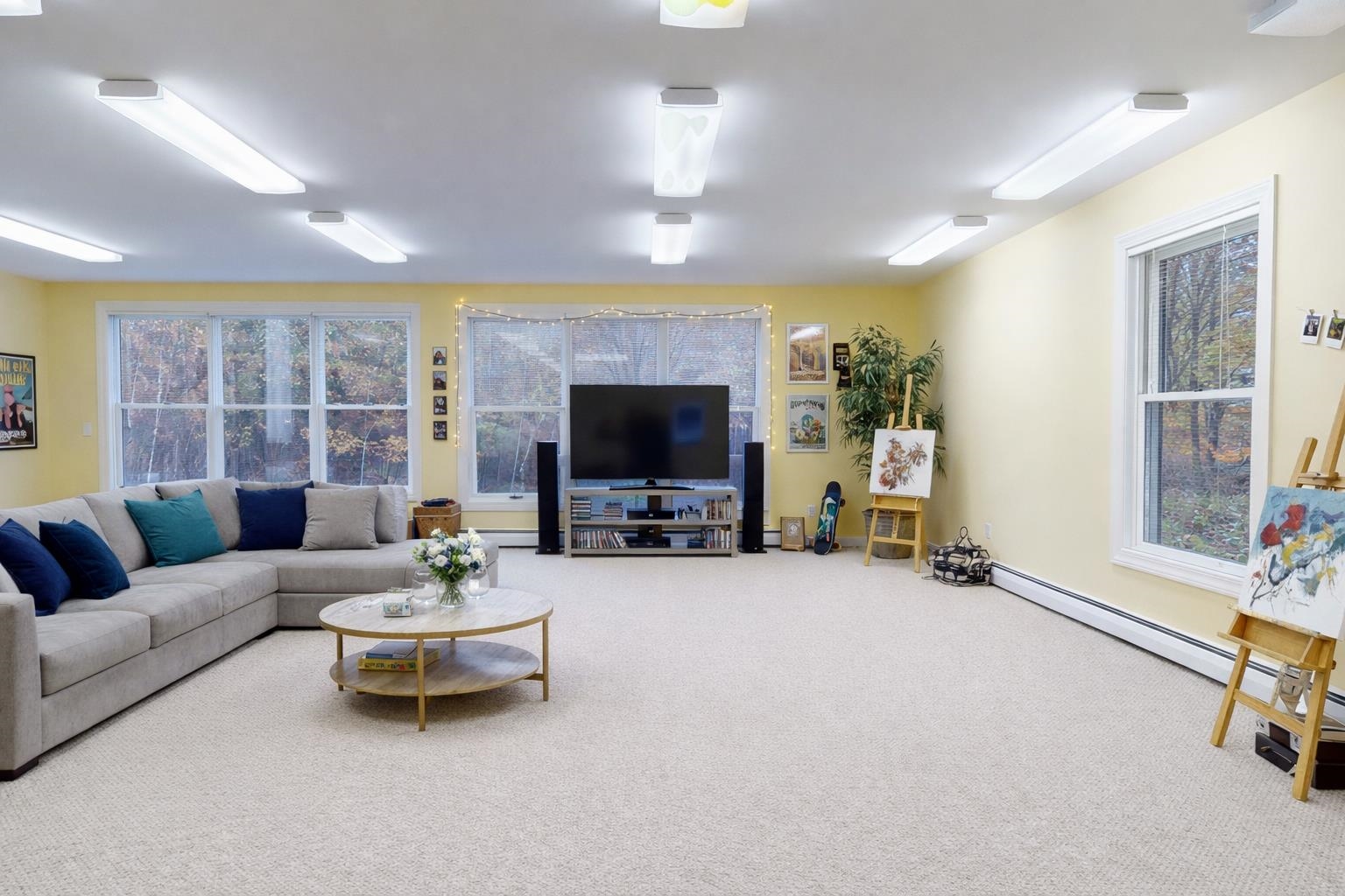 Set on 20 peaceful acres across from the conserved Mud Pond trail network, this thoughtfully designed 2-bedroom, 2-bath contemporary ranch offers comfortable single-level living in a private, nature-filled setting. A welcoming covered porch opens into a light-filled living room with a vaulted ceiling and expansive windows that frame the surrounding landscape. Oak hardwood floors extend throughout the main living areas and bedrooms. The updated kitchen features white cabinets, stainless steel appliances, granite countertops, and a classic subway tile backsplash, with easy access to a relaxing sunroom and back deck. The first-floor primary suite includes a full bath, built-ins, and a changing area with two large closets. A spacious multi-purpose room provides excellent flexibility—perfect for a home business, a cozy family room or a dedicated workout space. Its layout and privacy make it easy to tailor to your lifestyle. The finished walkout lower level adds remarkable versatility with a den, office, laundry room, home theater, two cedar closets, storage areas, and another multi-purpose room with a garage door—ideal for gardening projects, workshop needs, pet care, or specialty vehicle storage. Additional highlights include a spacious two-car attached garage, large shed, and generator. Surrounded by nature yet close to Williston conveniences, this property offers a rare blend of privacy, easy living, and room to enjoy the hobbies and lifestyle you love.
