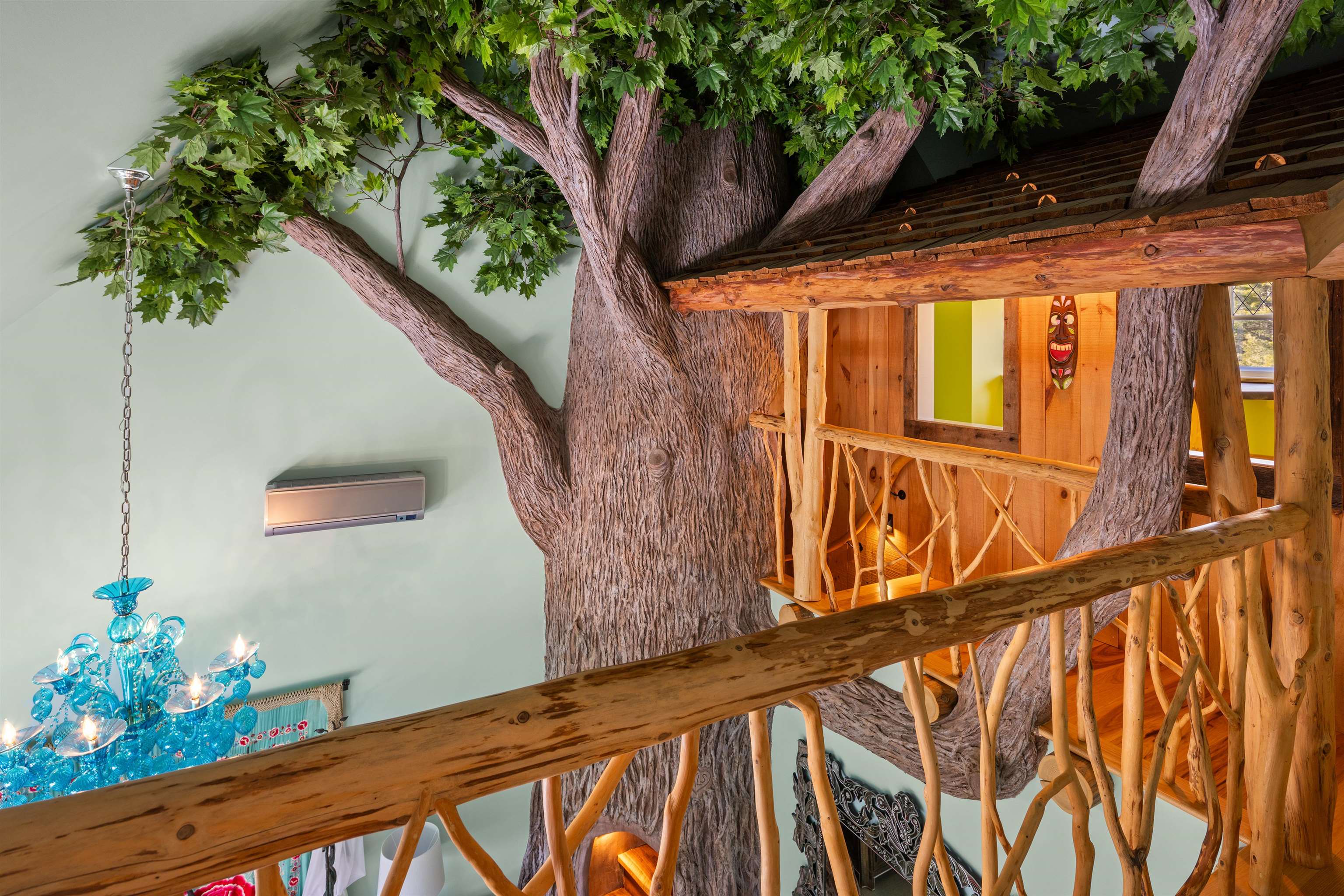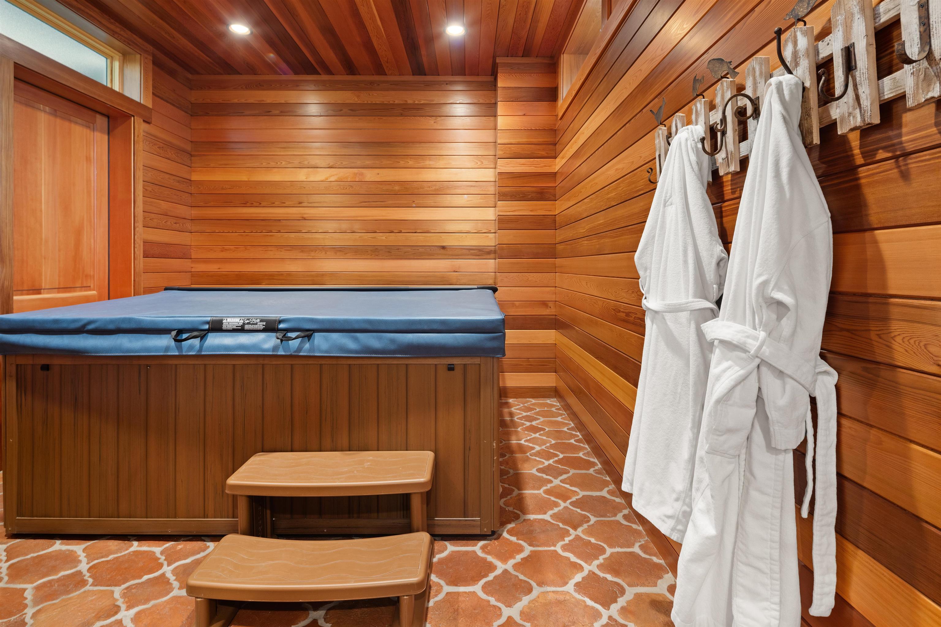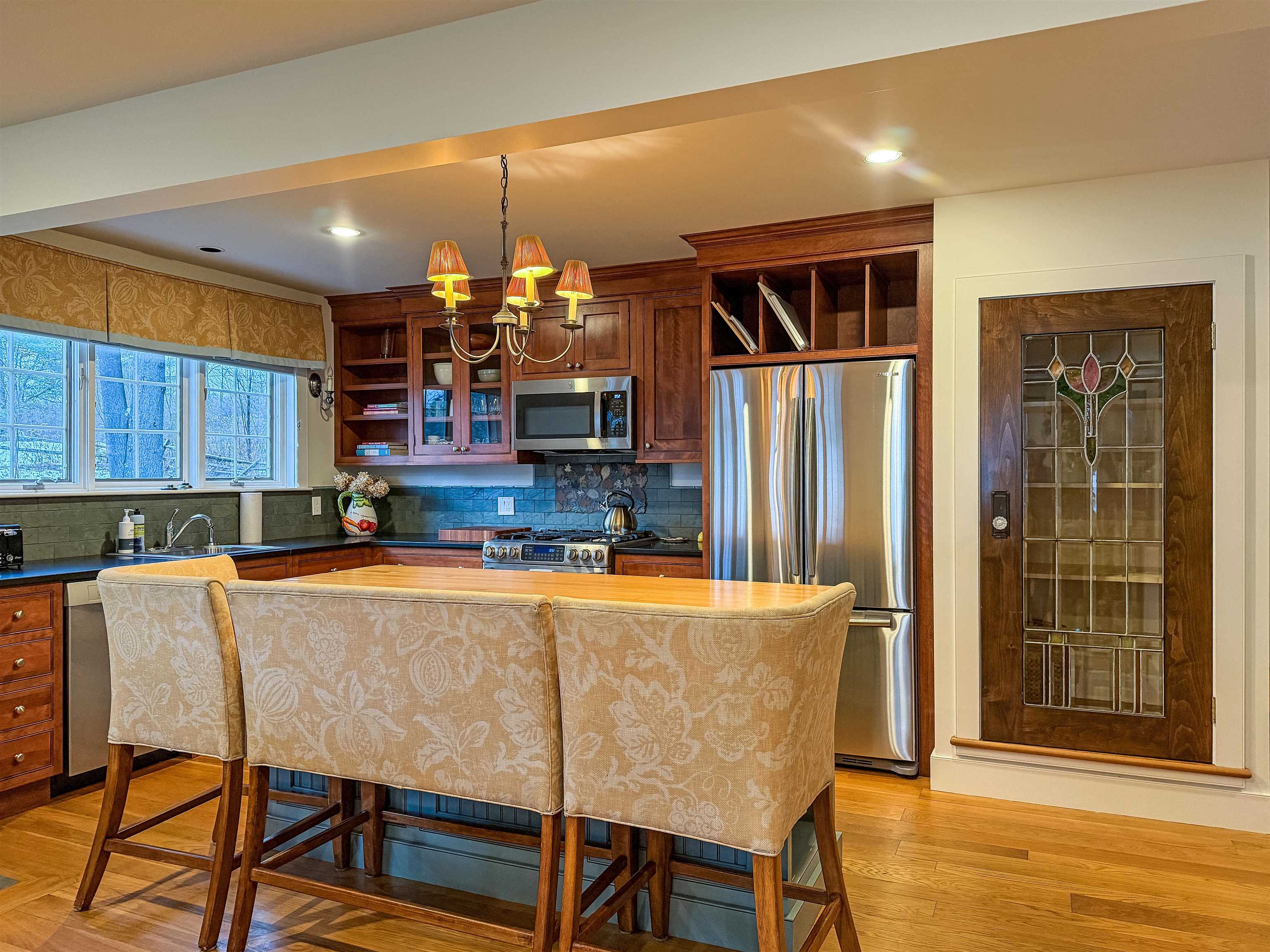 - Cathedral Ceiling, Ceiling Fan, Dining Area, Draperies, Gas Fireplace, 2 Fireplaces, Furnished, Hot Tub, Kitchen Island, Lead/Stain Glass, Primary BR w/ BA, Natural Light, Natural Woodwork, Security, Walk-in Closet, Window Treatment, Programmable Thermostat